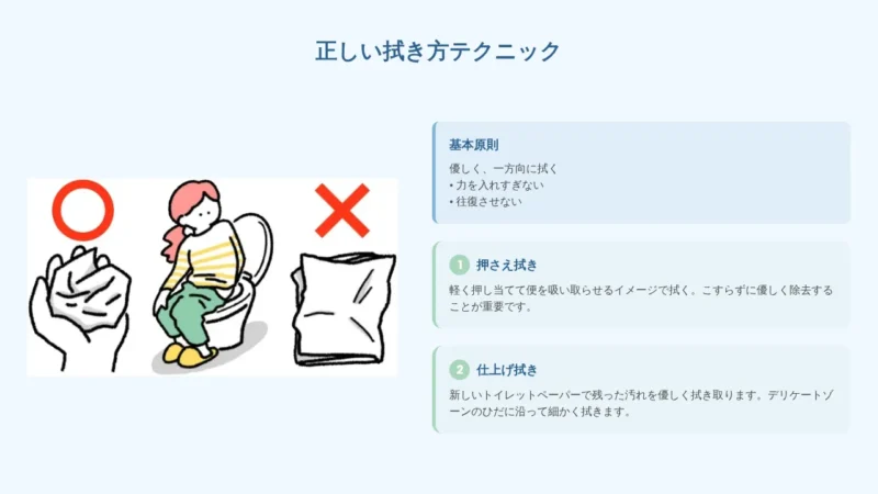 その後、仕上げ拭き」として、新しいトイレットペーパーで残った汚れを優しく拭き取ります。この際、デリケートゾーンに沿って、細かく、しかし力を入れずに拭くことが重要です。