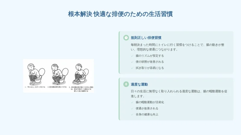 さらに、規則正しい排便習慣を身につけることも大切です。毎朝決まった時間にトイレに行く習慣をつけることで、腸の動きが整い、理想的な便通につながります。