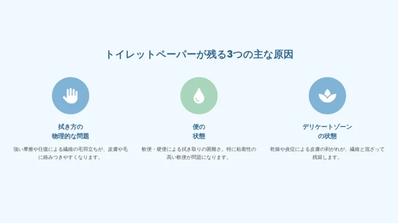 トイレットペーパーがお尻のデリケートな部分に残る現象には、主に三つの原因が考えられます。
