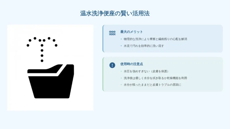 また、洗浄後は、トイレットペーパーで優しく水分を拭き取るか、乾燥機能を利用してください。水分が残ったままだと、かえって皮膚トラブルの原因となることがあります。